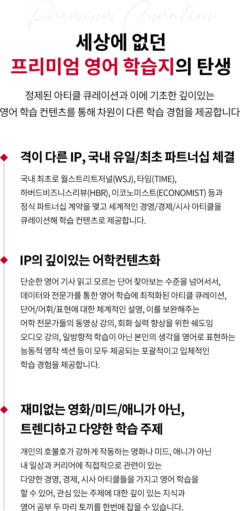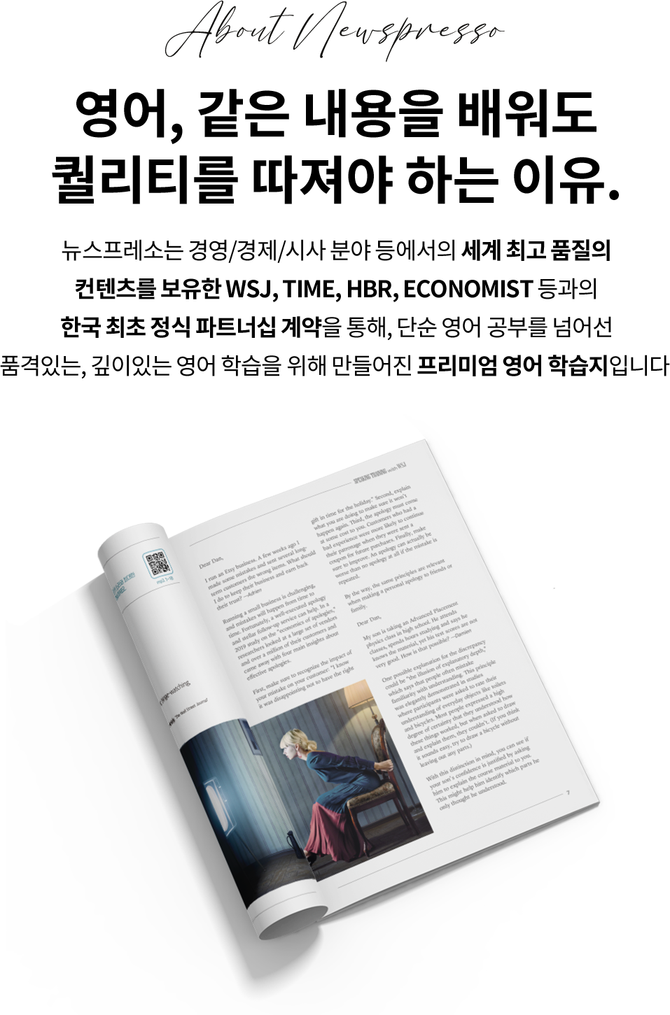 사실 영자 신문 해석하기는 그렇게 어렵지 않은데, 단순 영어 해석이 아니라 그 글에 내재된 정치, 사회, 문화적 맥락까지 배울 수 있는 영어 학습지라고 해서 타임 에디션을 시작했습니다. 영작 실력도 올리고 싶었는데 1:1 영작 첨삭이 가능한 점, 그리고 MP3 음원을 통해 기사 원문을 들어볼 수 있어서 매우 만족했습니다.